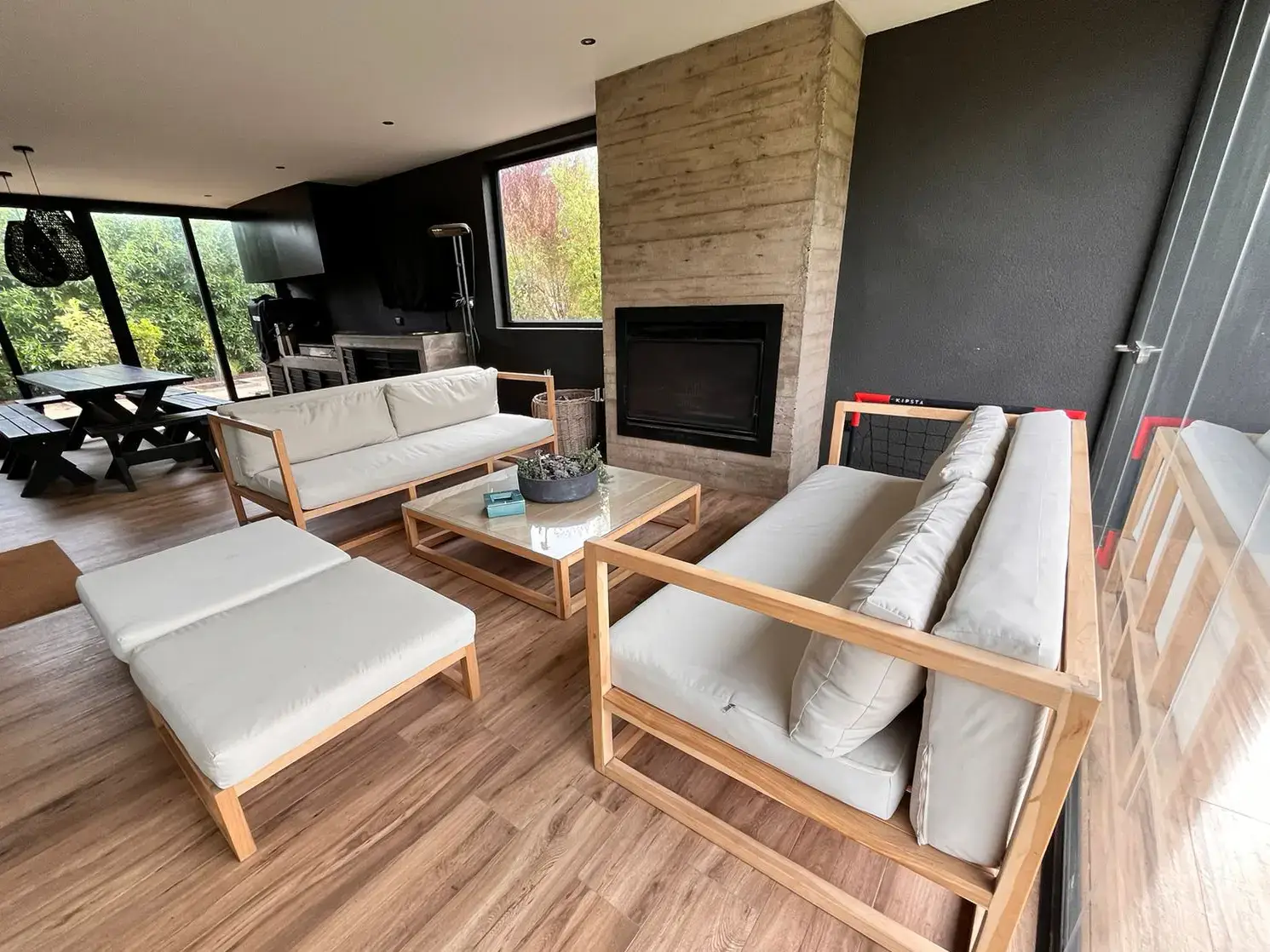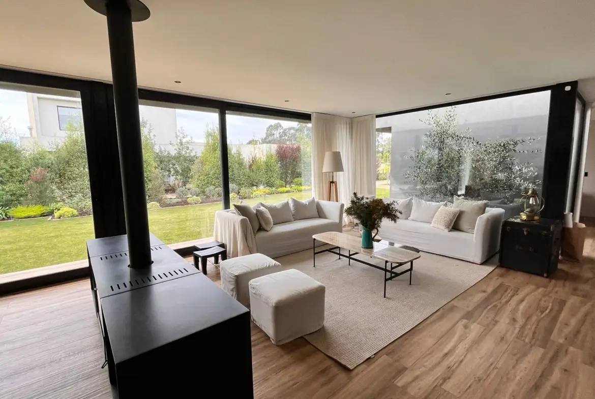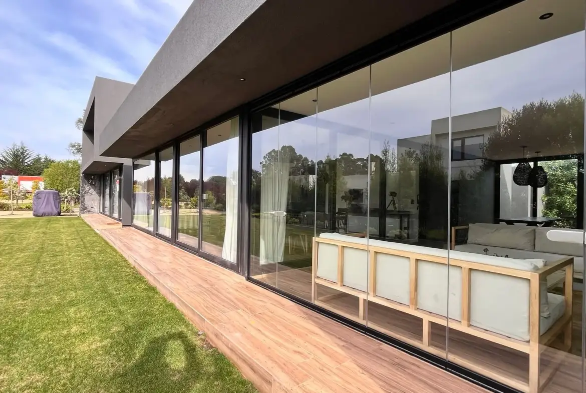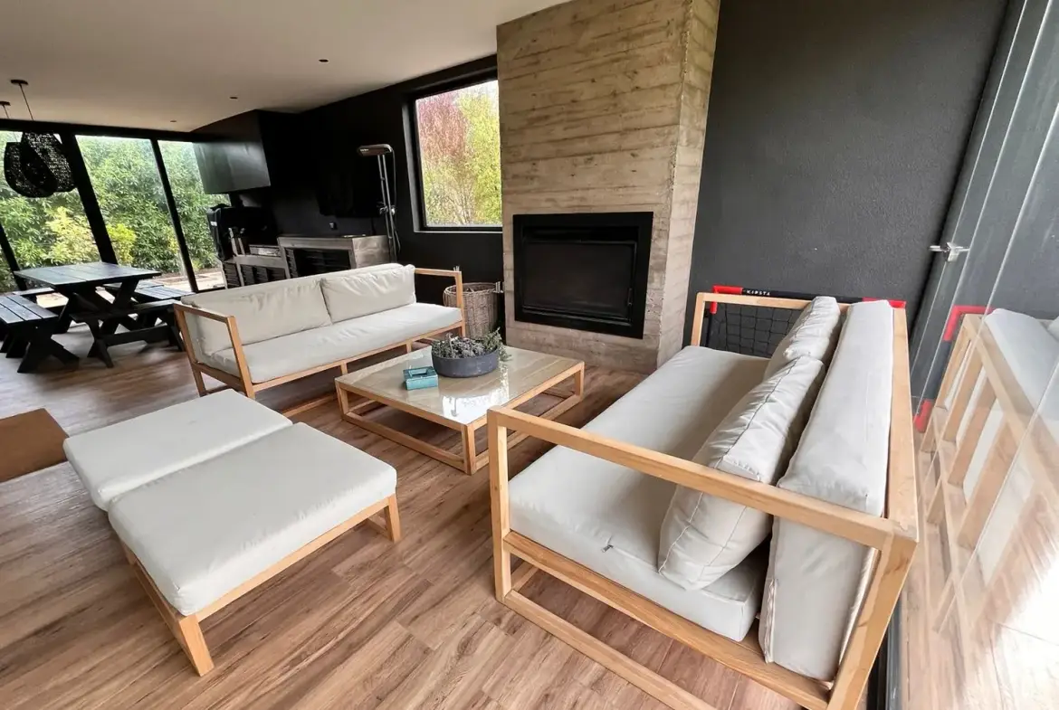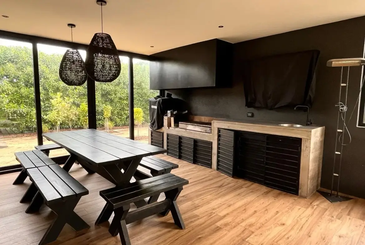 Quincho cerrado con vidrios, parrilla, Kevery, mesa de comedor y living