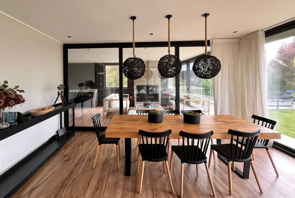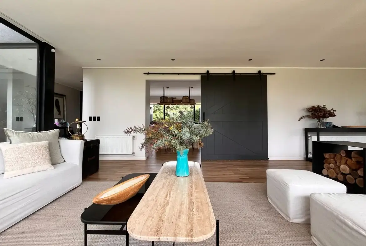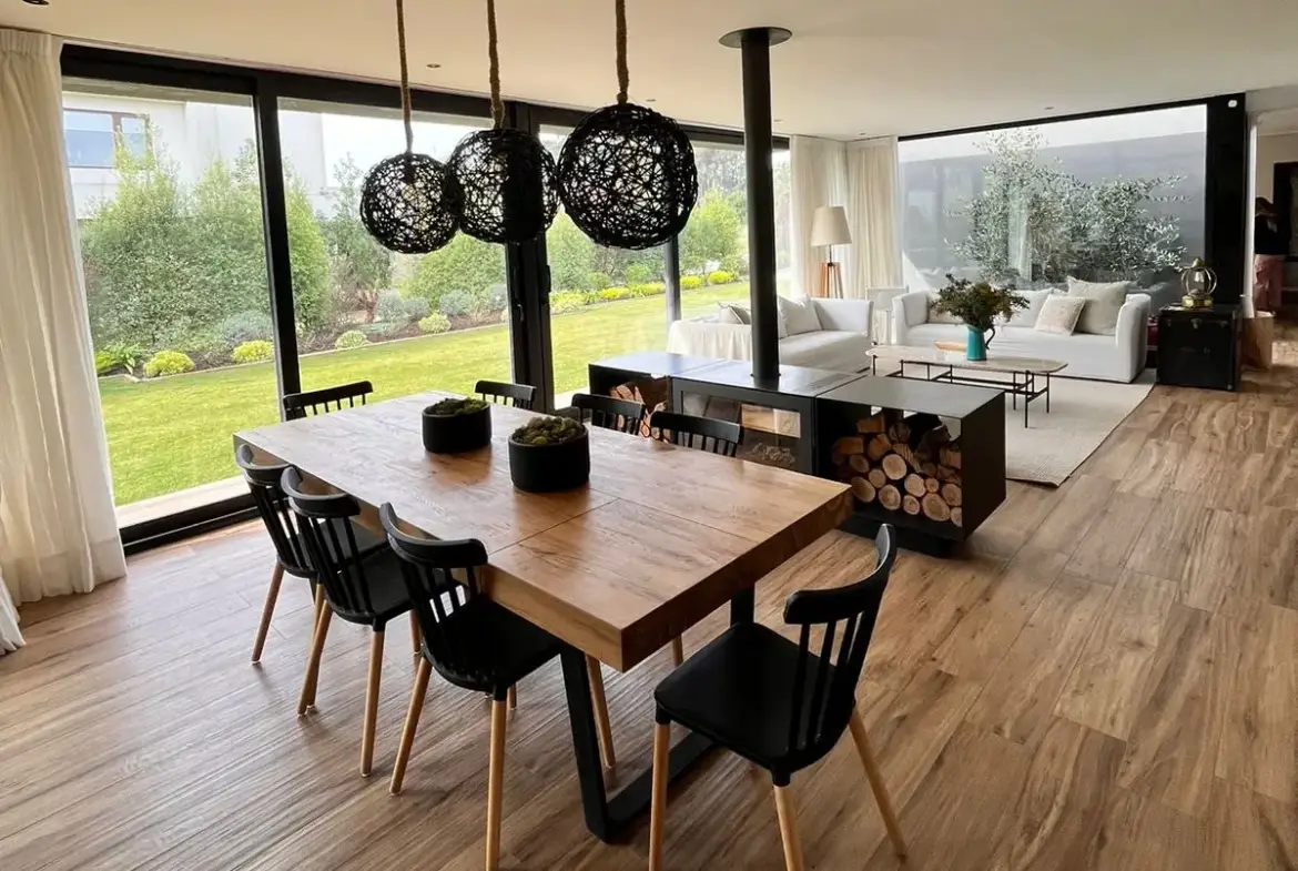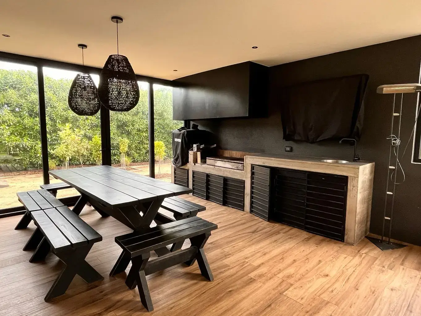 Quincho cerrado con vidrios, parrilla, Kevery, mesa de comedor y living