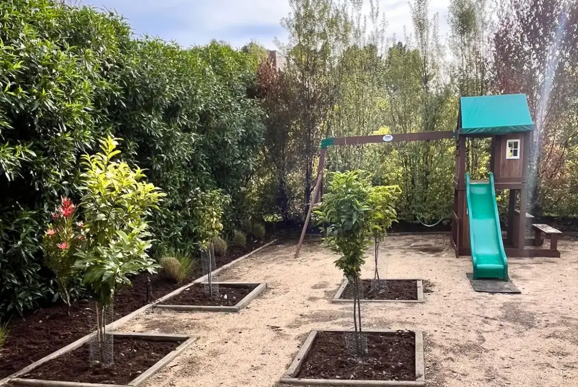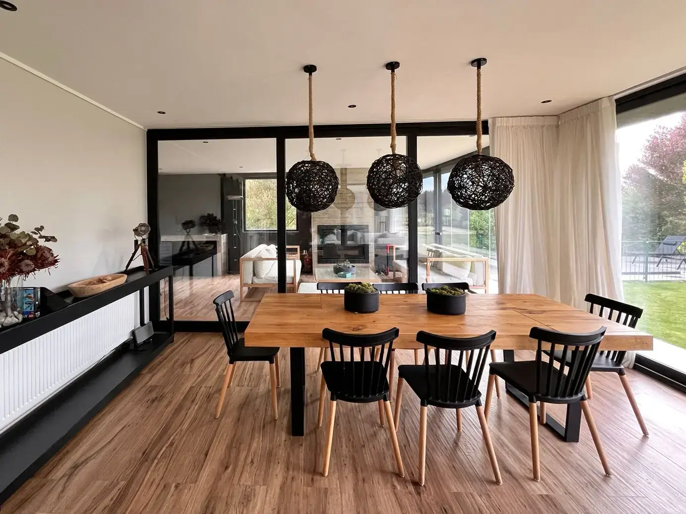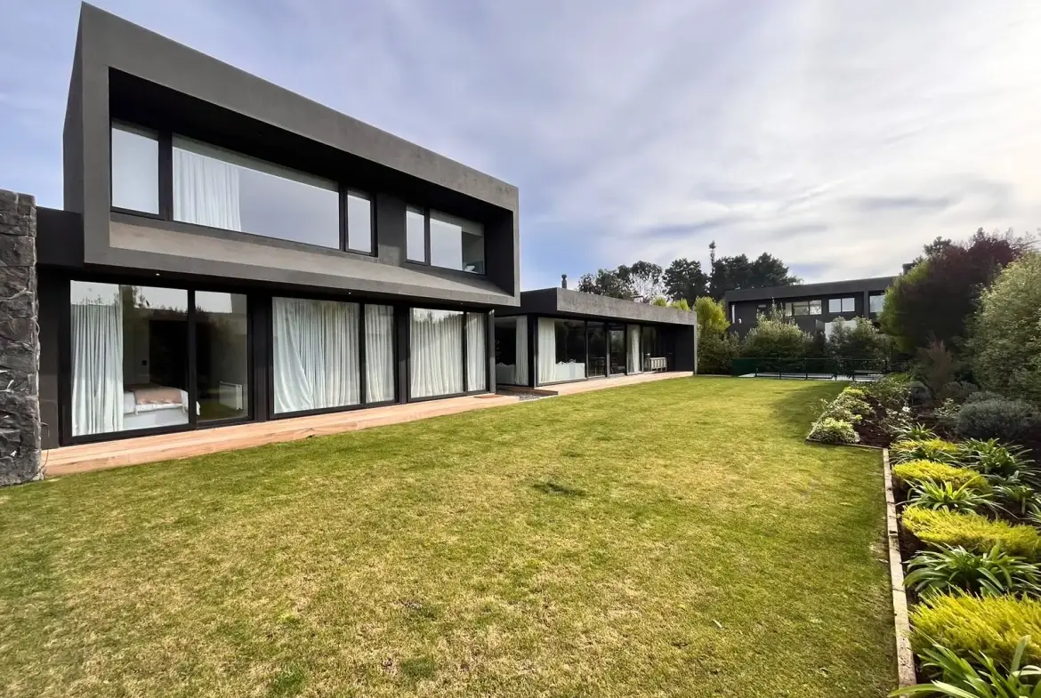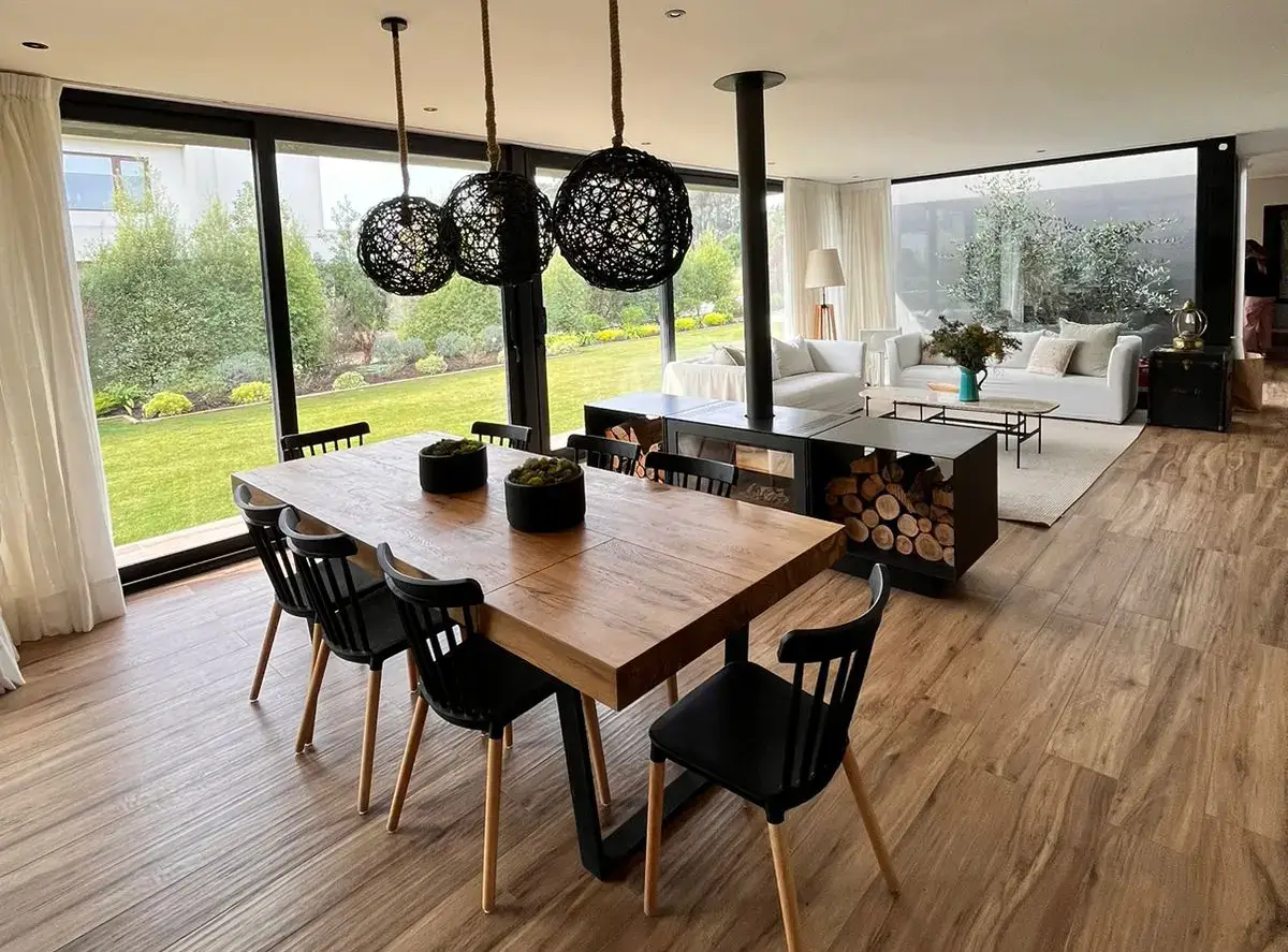 Quincho cerrado con vidrios, parrilla, Kevery, mesa de comedor y living
