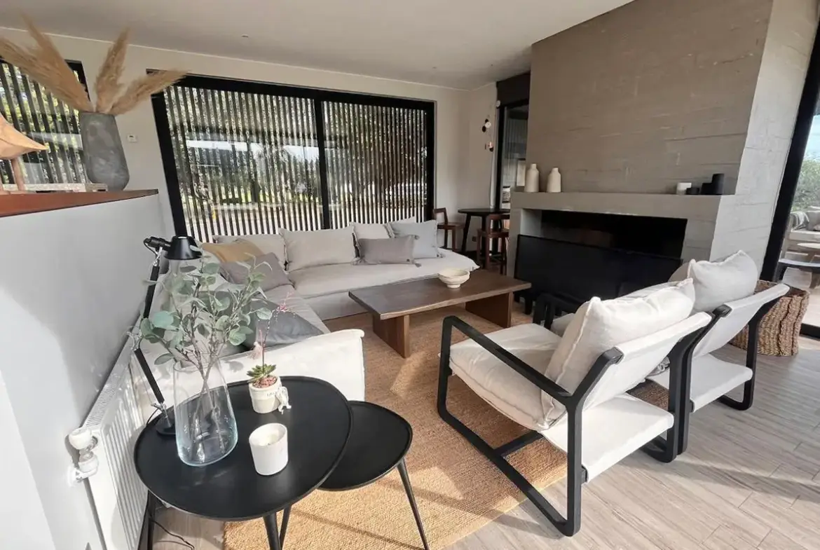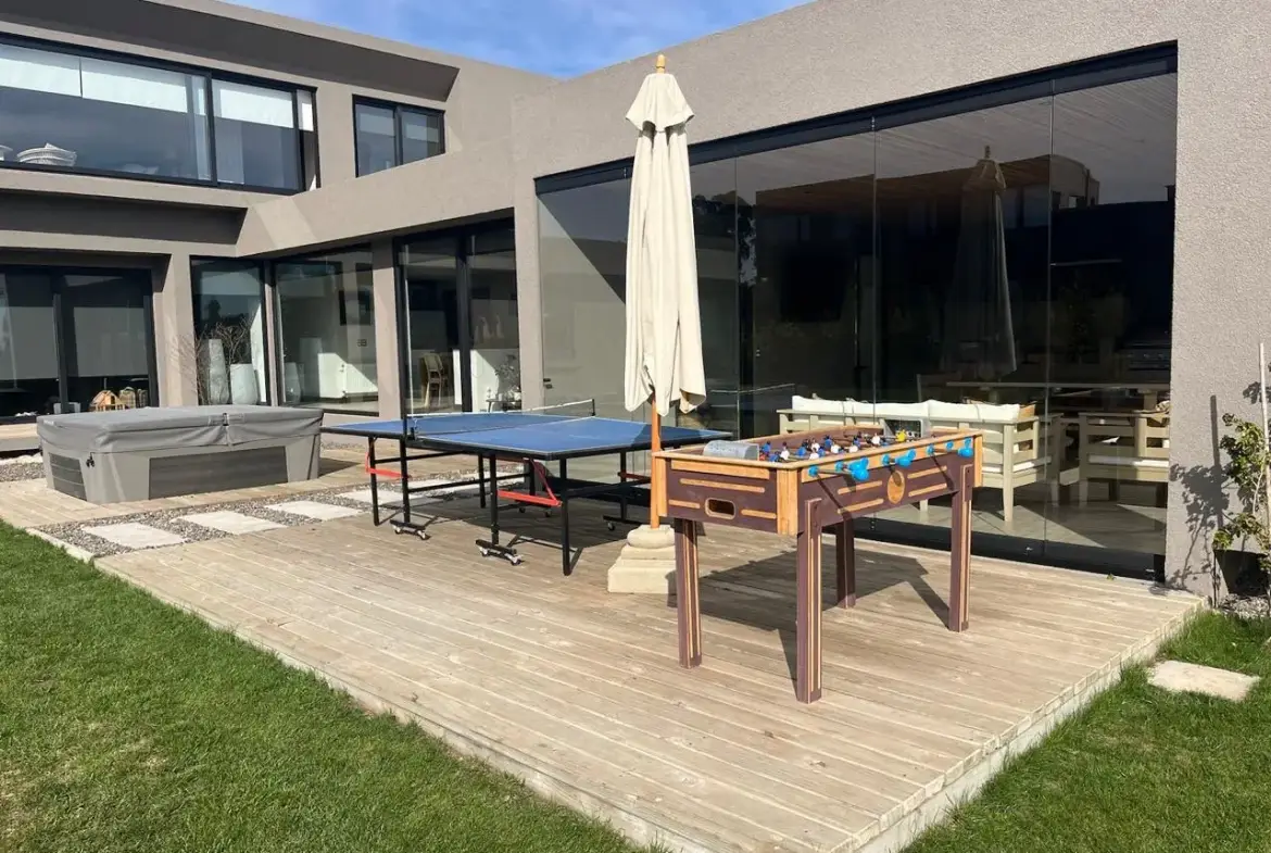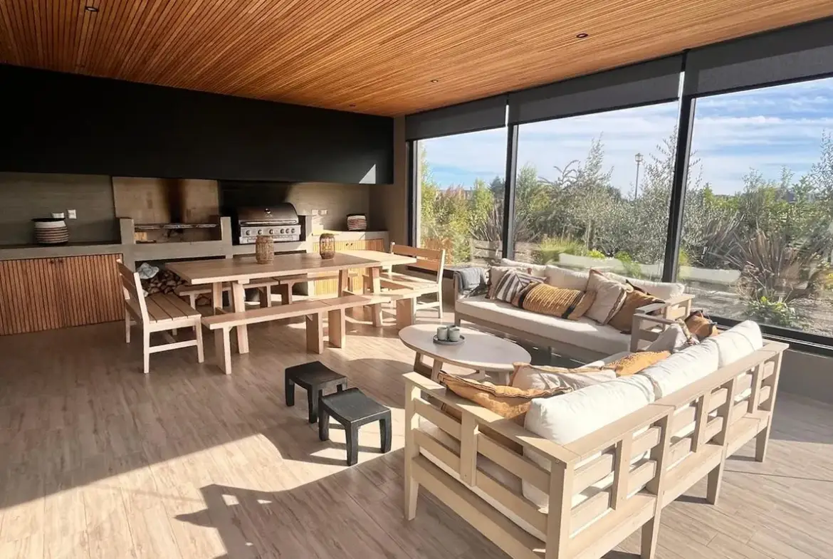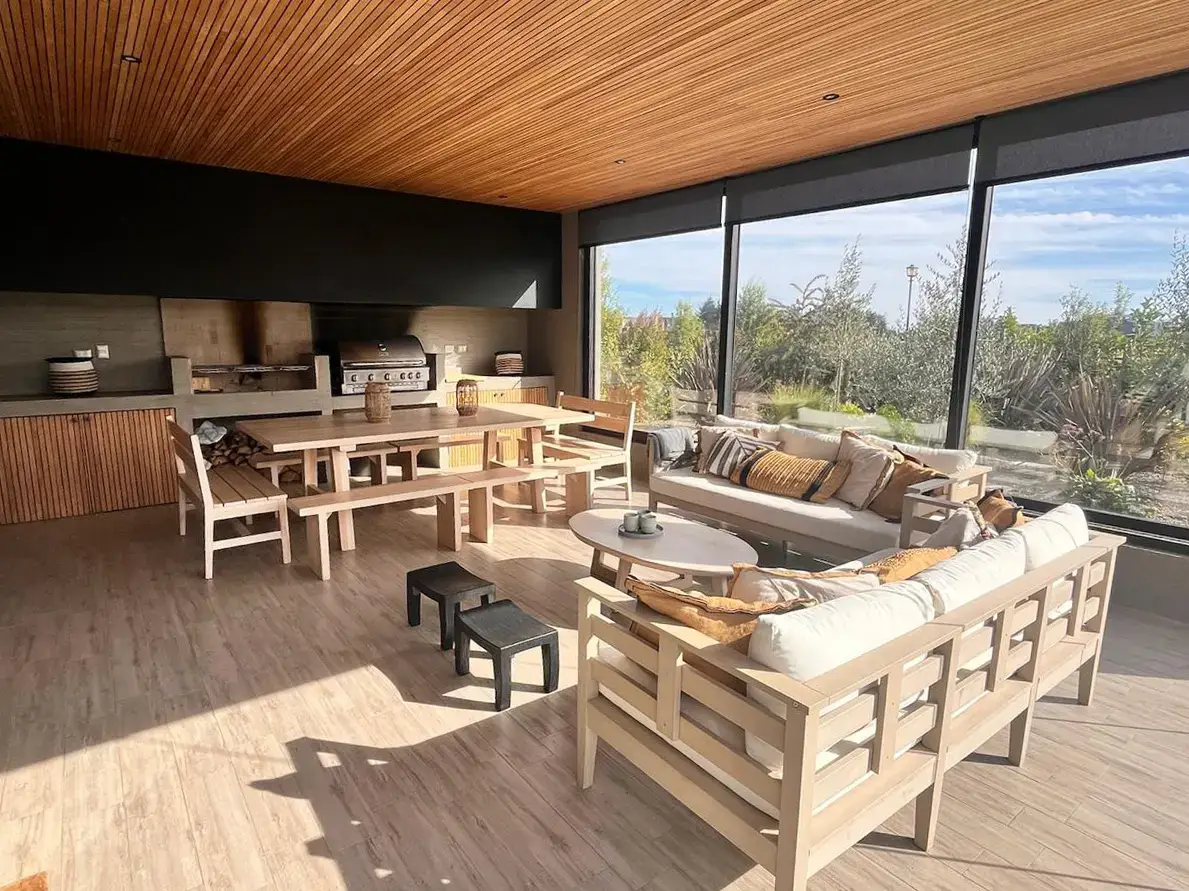 Quincho con parrilla a gas y carbón con mesa de comedor y living con tv. Posibilidad de cerrar.